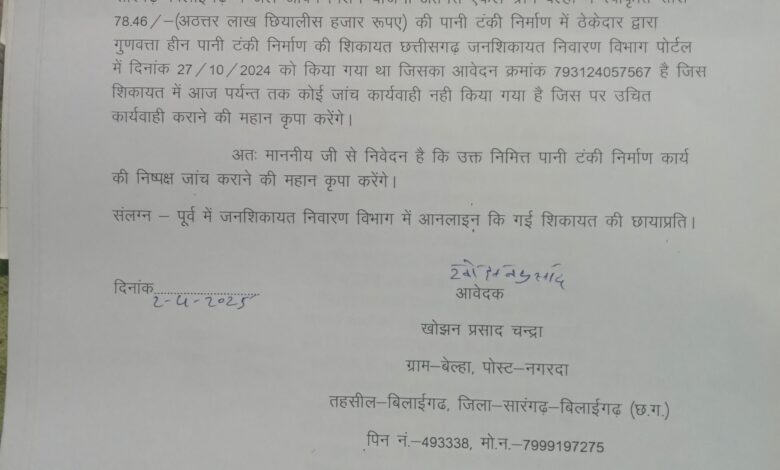 मिली जानकारी के अनुसार शिकायतकार्ता द्वारा ग्राम बेल्हा तहसील बिलाईगढ जिला सारंगढ़ बिलाईगढ़ में जल जीवन मिशन योजना अंतर्गत एकल ग्राम बेल्हा में स्वीकृति राशि 78.46 /-(अठत्तर लाख छियालीस हजार रूपए) की पानी टंकी निर्माण में ठेकेदार द्वारा गुणवत्ता हीन पानी टंकी निर्माण की शिकायत छत्तीसगढ़ जनशिकायत निवारण विभाग पोर्टल में दिनांक 27/10/2024 को किया गया था जिसका आवेदन क्रमांक 793124057567 है जिस शिकायत में आज पर्यन्त तक कोई जांच कार्यवाही नही किया गया है जिस पर उचित कार्यवाही कराने हेतु पोस्ट के माध्यम से मुख्यमंत्री छत्तीसगढ़ शासन को दिनांक 2 अप्रैल 2025 को शिकायत दर्ज कराई गई है अब देखना होगा कि शासन प्रशासन के द्वारा क्या कुछ कार्यवाही कि जाती है।