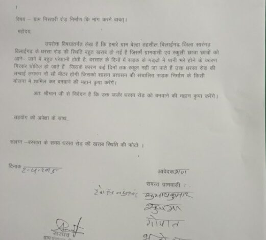 मिली जानकारी के अनुसार मांगकार्ता द्वारा बताया गया है कि हमारे ग्राम बेल्हा तहसील बिलाईगढ जिला सारंगढ़ बिलाईगढ़ के धरसा रोड़ निर्माण की स्थिति बहुत खराब हो गई है जिसमें ग्रामवासी एवं स्कुली छात्रा छात्रों को आने- जाने में बहुत परेशानी होती है बरसात के दिनों में सड़क के गडढ़ों में पानी भरे होने के कारण गिरकर चोटिल हो जाते है जिसके कारण कई दिनों तक स्कूल नही जा पाते है उक्त धरसा रोड़ की लम्बाई लगभग नौ सौ मीटर होगी जिसको शासन प्रशासन की संचालित योजनाओं में सामिल करने की मांग किया गया है।