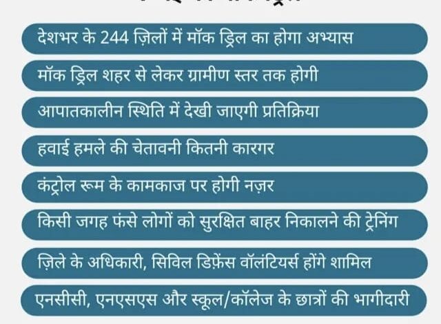 रायपुर – भारत सरकार ने पहलगाम हमले के बाद पाकिस्तान के साथ बढ़ते तनाव के बीच 7 मई को देश के 244 जिले माक ड्रिल करने का आदेश दिया है इस माक ड्रिल का उद्देश्य नागरिको को आपातकालीन स्थिति से निपटने के लिए जागरूक करना तथा सिविल डिफेंस की तैयारियां का आंकलन करना है माक ड्रिल में नागरिकों को हमले के दौरान सुरक्षित रहने का प्रशिक्षण दिया जाएगा।