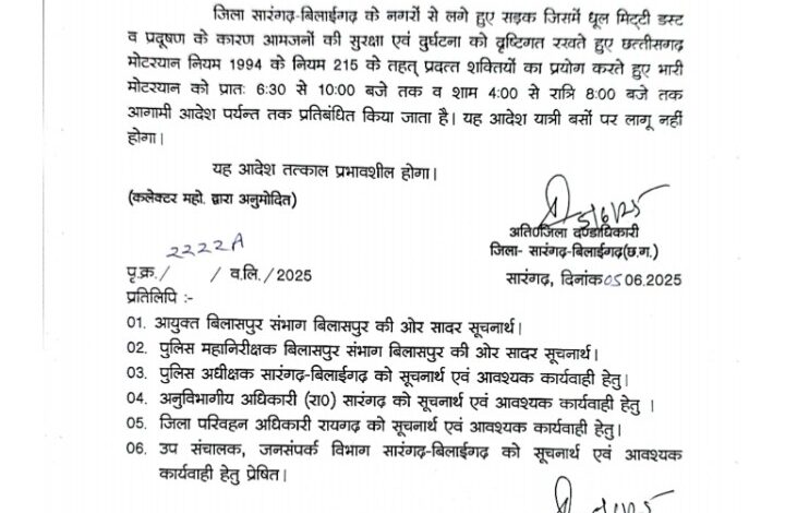 सारंगढ़ बिलाईगढ़ – सारंगढ़-बिलाईगढ़ जिले के नगरों से लगे हुए सड़क, जिसमें धूल, मिट्टी, डस्ट व प्रदूषण के कारण आमजनों की सुरक्षा एवं दुर्घटना को दृष्टिगत रखते हुए छत्तीसगढ़ मोटरयान नियम 1994 के नियम 215 के तहत् प्रदत्त शक्तियों का प्रयोग करते हुए भारी मोटरयान को प्रातः 6:30 से 10 बजे तक व शाम 4 बजे से रात्रि 8 बजे तक कलेक्टर डॉ संजय कन्नौजे ने प्रतिबंधित किया है। यह आदेश यात्री बसों पर लागू नहीं होगा। यह आदेश कलेक्टर कार्यालय सारंगढ़ बिलाईगढ़ से जारी किया गया है जो तत्काल और आगामी आदेश पर्यन्त तक प्रभावशील होगा।