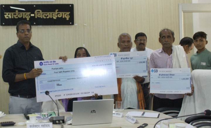 सारंगढ़ बिलाईगढ़ – कलेक्टर डाॅ. संजय कन्नौजे ने राजस्व आपदा अंतर्गत जिले के निवासियों के प्राकृतिक आपदा से मृत्यु होने पर उनके परिजनों के लिए राजस्व पुस्तक परिपत्र 6(4) के तहत चार लाख रूपए की स्वीकृति प्रदान की है। कलेक्टर डाॅ. कन्नौजे ने कलेक्टोरेट सभाकक्ष में मृतक के परिजनों को प्रतीकात्मक चेक प्रदान किया। यह आर्थिक सहायता परिजन के बैंक खाता में डायरेक्ट भुगतान किया जाएगा। आग में जलने से अंजली खड़िया निवासी ग्राम छिन्दपतेरा तहसील बरमकेला की मृत्यु होने पर पति भोजराम और पुत्री वंदना को संयुक्त रूप से, आकाशीय बिजली गिरने से सेतराम भारद्वाज निवासी ग्राम रेड़ा तहसील सारंगढ़ के मृत्यु होने पर पत्नि संतोषी भारद्वाज, आंधी तूफान में डंगाल गिरने से गणेशराम साहू निवासी ग्राम झुमका तहसील सरसींवा की मृत्यु होने पर पत्नि सहोद्री साहू को चार लाख रूपए का आर्थिक सहायता प्रदान किया गया।