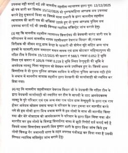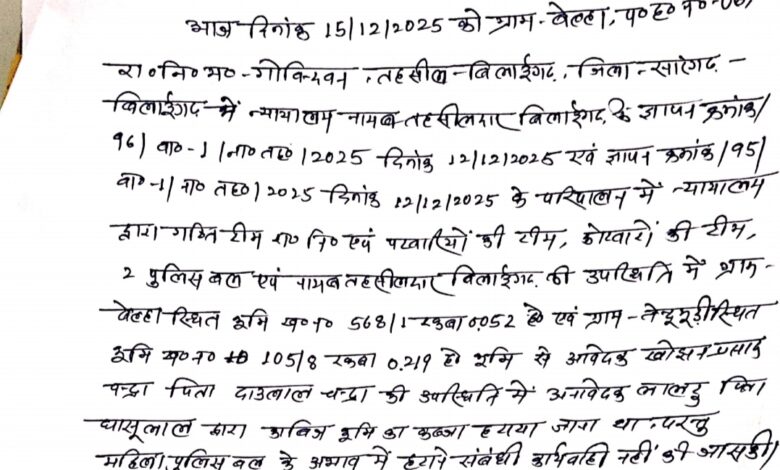प्राप्त मिली जानकारी के अनुसार शिकायतकर्ता खोझन प्रसाद चन्द्रा के द्वारा दिनांक 22 दिसंबर 2025 को प्रति में महामहीम राष्ट्रपति महोदया राष्ट्रपति भवन नई दिल्ली एवं प्रतिलिपि में माननीय गृहमंत्री भारत सरकार मंत्रालय नई दिल्ली ,महामहीम राज्यपाल छत्तीसगढ़ शासन राजभवन रायपुर , माननीय गृहमंत्री छत्तीसगढ़ शासन मंत्रालय नया रायपुर, श्रीमान पुलिस अधीक्षक कार्यालय सारंगढ़ बिलाईगढ़ को लिखित शिकायत पोस्ट के माध्यम से प्रस्तुत किया गया है जिसमें शिकायतकर्ता के द्वारा माननीय तहसील न्यायालय बिलाईगढ जिला सारंगढ़ बिलाईगढ (छ.ग.) में वर्ष 2023-24 में अपने हक की भूमि खसरा नं 568/1 रकबा 0.052 हे भूमि ग्राम बेल्हा स्थित एवं खसरा नं 105/8 रकबा 0.219 हे भूमि ग्राम तेन्दुमूडी स्थित की निजी भूमि को छत्तीसगढ़ शासन की नियम अनुसार सीमांकन करा कर सीमांकन फिल्ड बुक के साथ में माननीय तहसील न्यायालय बिलाईगढ में भू.रा.स.1959 की धारा 250 के तहत बेदखली कराने हेतु आवेदन प्रस्तुत किया गया था जिसमें माननीय तहसील न्यायालय बिलाईगढ द्वारा दिनांक 05/12/2025 को आवेदक खोझन प्रसाद चन्द्रा पिता स्व.दाऊलाल चन्द्रा के पक्ष में आदेश पारित किया गया जिसमें आनवेदक लालटू पिता घसुलाल के विरूद्ध उक्त भूमि से बेदखल कर बेदखली वारंट जारी किया गया था।, माननीय तहसील न्यायालय की बेदखली वारंट जारी में पुलिस थाना बिलाईगढ के प्रभारी को पुलिस बल उपलब्ध कराने हेतु पत्र जारी किया गया था जिसमें दिनांक 05/12/2025 से 15/12/2025 तक नियत तिथि में पुलिस बल उपलब्ध कराने हेतु सूचनार्थ किया था नियत तिथि में थाना प्रभारी के द्वारा माननीय तहसील न्यायालय की जारी पत्र की धज्जियां उड़ाते हुए पुलिस बल उपलब्ध नही कराई गई ।तो माननीय तहसील न्यायालय द्वारा पुनः 12/12/2025 को पत्र जारी कर दिनांक 15/12/2025 को पुरूष/महिला आरक्षक बल उपलब्ध कराने हेतु सूचनार्थ किया था जिसमें थाना प्रभारी के द्वारा माननीय तहसील न्यायालय की जारी पत्र की धज्जियां उड़ाते हुए दो पुरुष आरक्षक पुलिस बल उपलब्ध कराई गई थी।, माननीय तहसील न्यायालय बिलाईगढ की बेदखली वारंट जारी पत्र के परिपालन में स्वयं माननीय नायब तहसीलदार देवराज सिदार जी,राजस्व निरीक्षक श्री जीवन साहू,ग्राम बेल्हा के पटवारी श्री योगेश खूंटे सहित अन्य पांच हलकों के पटवारी,माल जमादार कमल नायक एवं ग्राम कोटवार महिला/पुरुष की गठित टीम ने दिनांक 15/12/2025 को खसरा नं 568/1 रकबा 0.052 हे भूमि स्थित एवं खसरा नं 105/8 रकबा 0.219 हे भूमि स्थित तेन्दुमूडी की भूमि से आनवेदक लालटू पिता घसुलाल को बेदखल करने उपस्थित हुए थे। जिनमें थाना बिलाईगढ से दो पुरुष पुलिस आरक्षक सामिल थे महिला पुलिस आरक्षक नही होने के अभाव में माननीय नायाब तहसील द्वारा बेदखली की कार्यावही को स्थगित कर दिया गया।, 
