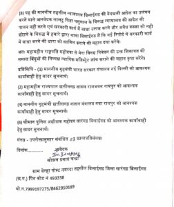 बिलाईगढ़ – थाना बिलाईगढ़ के प्रभारी शिव कुमार धारी एवं अवैध कब्जाधारी लालटू के विरूद्ध महामहीम राष्ट्रपति को किया गया लिखित शिकायत।