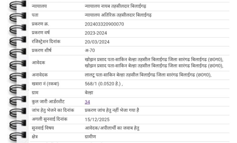 प्राप्त मिली जानकारी के अनुसार आवेदनकर्ता खोझन प्रसाद चन्द्रा के द्वारा छत्तीसगढ़ भू राजस्व संहिता 1959 की धारा 250 के तहत ग्राम बेल्हा स्थित भूमि खसरा नं 568/1 रकबा 0.052 हे भूमि की टुकड़ा 0.025 हे भूमि में आनवेदक लालटू उर्फ संतोष के द्वारा अवैधानिक कब्जा करने के संबंध में नायाब तहसीलदार न्यायालय बिलाईगढ़ में माह मार्च 2024 में आवेदन प्रस्तुत किया गया था जिस आवेदन के साथ में सीमांकन फिल्ड बुक,बी.1, खसरा, नक्शा की प्रति प्रस्तुत किया था जिसमें नायाब तहसीलदार न्यायालय बिलाईगढ़ द्वारा दिनांक 20 मार्च 2024 को रजिस्ट्रेशन कर प्रकरण शीर्ष अ-70 में लिया गया जिसका प्रकरण क्रमांक 202403320900070 है जिसमें नायाब तहसीलदार न्यायालय बिलाईगढ़ में वर्ष 2023-24 में प्रकरण दर्ज कर प्रकरण में आनवेदक लालटू उर्फ संतोष को समन जारी कर आहूत किया गया था। उक्त प्रकरण में तहसील न्यायालय बिलाईगढ़ द्वारा कुल सुनवाई 34 आर्डरशीट लिया गया सुनवाई पस्चात आवेदक खोझन प्रसाद चन्द्रा के पक्ष में आदेश करते हुए आनवेदक लालटू उर्फ संतोष को उक्त अवैधानिक कब्जा से बेदखल कर 5 दिसंबर 2025 को प्रकरण नस्तीबद्ध किया गया है।
