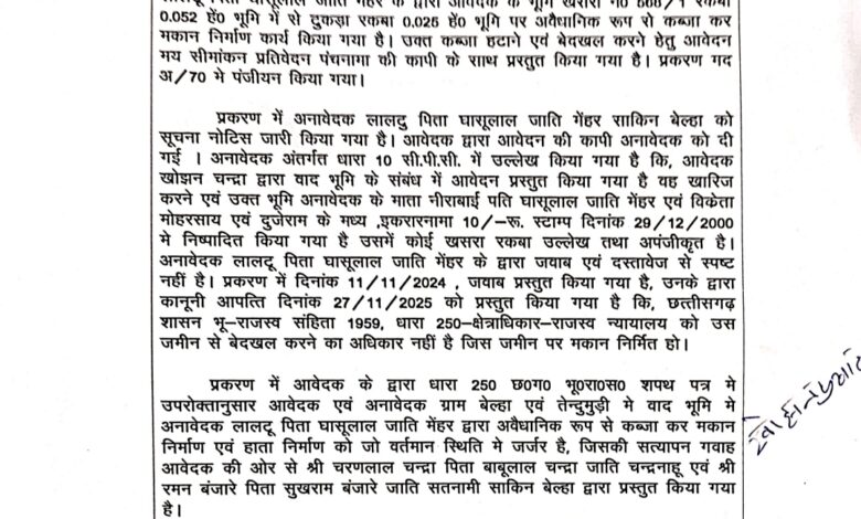प्रकरण में आनवेदक लालटू उर्फ संतोष सकिन बेल्हा को सूचना नोटिस जारी किया गया। आवेदक द्वारा आवेदन की कापी आनवेदक को दी गई। आनवेदक अंतर्गत धारा 10 सी.पी.सी.में उल्लेख किया गया है कि आवेदक खोझन प्रसाद चन्द्रा द्वारा वाद भूमि के संबंध में आवेदन प्रस्तुत किया गया है वह खारिज करने एवं उक्त भूमि आनवेदक के माता नीरा बाई पति घसुलाल एवं विक्रेता मोहरसाय एवं दुजेराम के माध्य इकरारनामा 10/- रू स्टाम्प दिनांक 29/12/2000 में निष्पादित किया गया है उसमें कोई खसरा रकबा उल्लेख तथा अपंजीकृत है आनवेदक लालटू उर्फ संतोष के द्वारा जवाब एवं दस्तावेज से स्पष्ट नही है प्रकरण में दिनांक 11/11/2024 जवाब प्रस्तुत किया गया है उनके द्वारा कानूनी आपत्ति दिनांक 27/11/2025 को प्रस्तुत किया गया है कि छत्तीसगढ़ शासन भू- राजस्व संहिता 1959 की धारा 250 – क्षेत्राधिकार – राजस्व न्यायालय को उस जमीन से बेदखल करने का अधिकार नही है जिस जमीन पर मकान निर्मित हो।