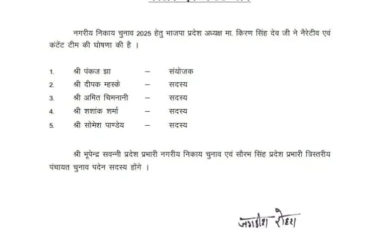 पार्टी का उद्देश्य आगामी चुनावों में स्थानीय स्तर पर मजबूत रणनीति बनाकर जीत हासिल करना है। इसके लिए समिति के सदस्य जल्दी ही अपने दायित्वों का निर्वहन शुरू करेंगे। इसके अलावा बीजेपी ने अपनी नैरेटिव और कंटेट टीम भी तैयार की है। इस टीम की कमान सीएम विष्णु देव साय के मीडिया सलाहकार पंकज झा को सौंपी गई हैं।