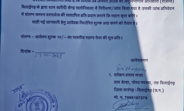 सारंगढ़ बिलाईगढ़ – विकास खण्ड बिलाईगढ के अंतर्गत धान खरीदी केन्द्र सलौनिकला कि जांच रिपोर्ट को सूचना के अधिकार अधिनियम 2005 के तहत मांग किया गया। प्राप्त मिली जानकारी के अनुसार आवेदक खोझन प्रसाद चन्द्रा एवं रामनाथ चौहान के द्वारा अनुविभागीय अधिकारी कार्यालय राजस्व बिलाईगढ़ में दिनांक 27 जनवरी 2025 को सूचना के अधिकार अधिनियम 2005 के तहत आवेदन प्रस्तुत किया गया है जिसमें धान खरीदी केन्द्र सलौनिकला में दिनांक 24 जनवरी 2025 को अनुविभागीय अधिकारी राजस्व बिलाईगढ़ के जांच किया गया है उसकी जांच प्रतिवेदन में संलग्न समस्त दस्तावेज कि सत्यापित प्रति कि मांग किया गया।