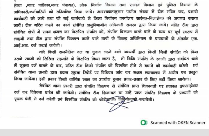 सारंगढ़ बिलाईगढ़ – कलेक्टर धर्मेश कुमार साहू ने आदेश जारी कर कहा है कि छत्तीसगढ़ सम्पत्ति विरूपण निवारण अधिनियम 1994 के प्रावधानों का कठोरतापूर्वक अनुपालन सुनिश्चित करते हुए प्रभावी कार्यवाही की जाये।कोई भी शासकीय कर्मी, किसी भी मकान और दुकान मालिक को संपत्ति विरूपण में सहमति है तो लिखित सहमति पत्र प्राप्त करेंगे। यदि किसी व्यक्ति द्वारा सहमति के लिए दबाव बनाया जाता है तो यह निर्वाचन नियमों का उल्लंघन है और उस व्यक्ति के विरुद्ध कार्यवाही किया जाएगा।