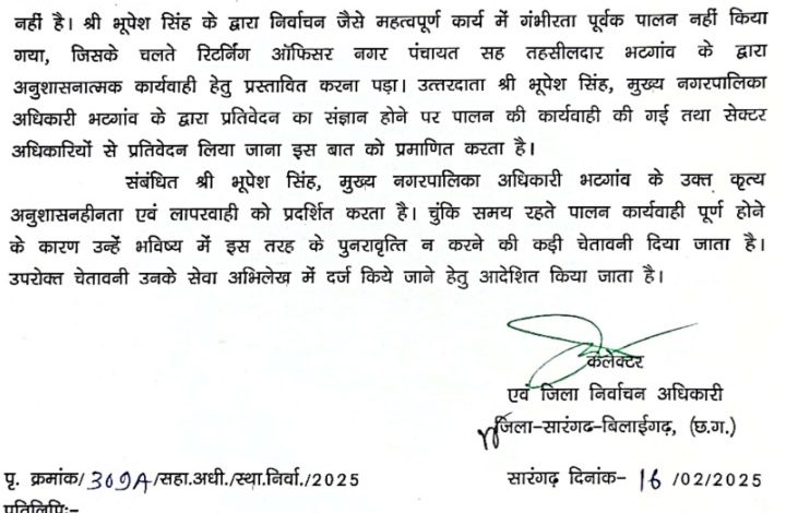 सारंगढ़ बिलाईगढ़ – कलेक्टर एवं जिला निर्वाचन अधिकारी धर्मेश कुमार साहू ने सीएमओ भटगांव भूपेश सिंह को भविष्य में निर्वाचन कार्य में लापरवाही नहीं करने की कड़ी चेतावनी दी है और यह चेतावनी उनके सेवा अभिलेख में दर्ज करने के लिए आदेश किया है। उल्लेखनीय है कि रिटर्निंग अधिकारी नगर पंचायत भटगांव ने निर्वाचन संबंधी महत्वपूर्ण कार्यों में लापरवाही बरतने के लिए सीएमओ भूपेश सिंह के विरुद्ध अनुशासनात्मक कार्य वाही के लिए प्रतिवेदन दिया गया था, जिसमें सीएमओ को कारण बताओ नोटिस जारी किया गया। सीएमओ ने प्रतिवेदन का संज्ञान होने पर कार्य किया और सीएमओ के जवाब संतोषजनक नहीं होने के उन्हें चेतावनी दी गई है।