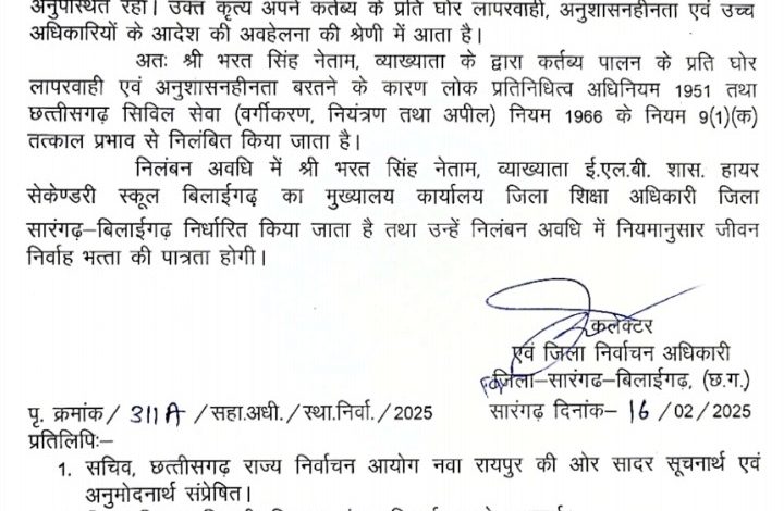 कालीचरण चंद्रा शिक्षक और भरत सिंह नेताम व्याख्याता एल बी, पंचायत चुनाव ड्यूटी में अनुपस्थित रहने के कारण सस्पेंड हो गए हैं। इन दोनों को मतदान दलों को मतदान सामग्री वितरण हेतु निर्वाचन ड्यूटी लगाई गई थी, जिसमें ये दोनों अनुपस्थित थे। निर्वाचन संबंधी महत्वपूर्ण कार्यों में घोर लापरवाही बरतने एवं अनुशासनहीन कार्य करने पर कालीचरण चंद्रा शिक्षक और भरत सिंह नेताम व्याख्याता एलबी को कलेक्टर एवं जिला निर्वाचन अधिकारी धर्मेश कुमार साहू ने छत्तीसगढ़ सिविल सेवा आचरण नियम 1966 के नियम 9 (1) (क) के तहत तत्काल प्रभाव से निलंबित किया है।