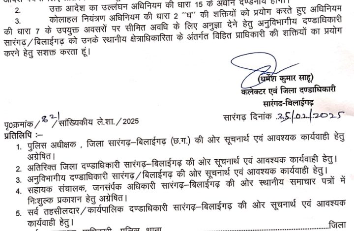 सारंगढ़ बिलाईगढ़ – कलेक्टर एवं जिला दंडाधिकारी धर्मेश कुमार साहू ने स्कूल कॉलेज के वार्षिक परीक्षा के दौरान विद्यार्थियों के अध्ययन में होने वाले व्यवधान को ध्यान में रखते हुए 31 मई 2025 तक रात्रि 10 बजे से सुबह 6 बजे तक कोलाहल नियंत्रण अधिनियम के तहत सभी ध्वनि विस्तारक यंत्रों पर प्रतिबंध किया है। इस प्रतिबंध पर आवश्यक कार्रवाई के लिए कलेक्टर ने एसपी, अतिरिक्त जिला दंडाधिकारी, सभी एसडीएम, तहसीलदार और थाना प्रभारी को कठोरतापूर्वक नियम का पालन करने के लिए निर्देशित किया है और बिना अनुमति कोई लाउडस्पीकर डीजे बजाने के उल्लंघन पाए जाने पर अपने पदीय दायित्व का निर्वहन करते हुए कठोर अनुशासनात्मक कार्रवाई करने के लिए आदेशित किया है।