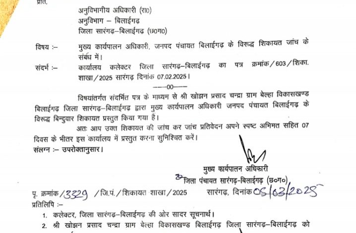 प्राप्त मिली जानकारी के अनुसार जिला सी ई ओ सारंगढ़ बिलाईगढ़ के द्वारा दिनांक 5/3/2025 को अनुविभागीय अधिकारी बिलाईगढ को सात दिवस के भीतर जांच कर जांच प्रतिवेदन अपने स्पष्ट अभिमत सहित इस कार्यालय में प्रस्तुत करना सुनिश्चित करने हेतु पत्र जारी किया गया है। अब देखना होगा कि अनुविभागीय अधिकारी बिलाईगढ के द्वारा उक्त शिकायत जांच को कब तक पुरा कर लिया जाएगा देखना होगा।