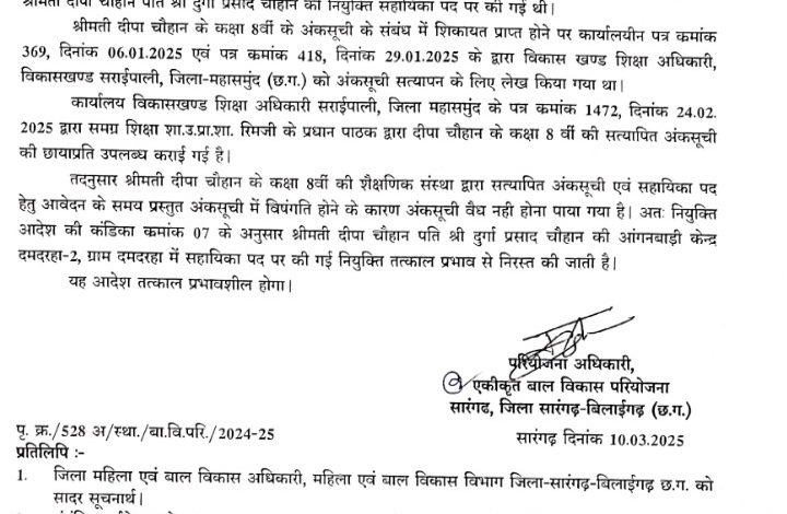 दीपा चौहान के कक्षा 8वीं की शैक्षणिक संस्था द्वारा सत्यापित अंकसूची एवं सहायिका पद हेतु आवेदन के समय प्रस्तुत अंकसूची में विसंगति होने के कारण अंकसूची वैध नही पाया गया। एकीकृत बाल विकास परियोजना सारंगढ़ के परियोजना अधिकारी ने नियुक्ति आदेश की कंडिका कमांक 07 के अनुसार दीपा चौहान की आंगनबाड़ी केन्द्र दमदरहा-2, ग्राम दमदरहा में सहायिका पद पर की गई नियुक्ति तत्काल प्रभाव से निरस्त किया है।